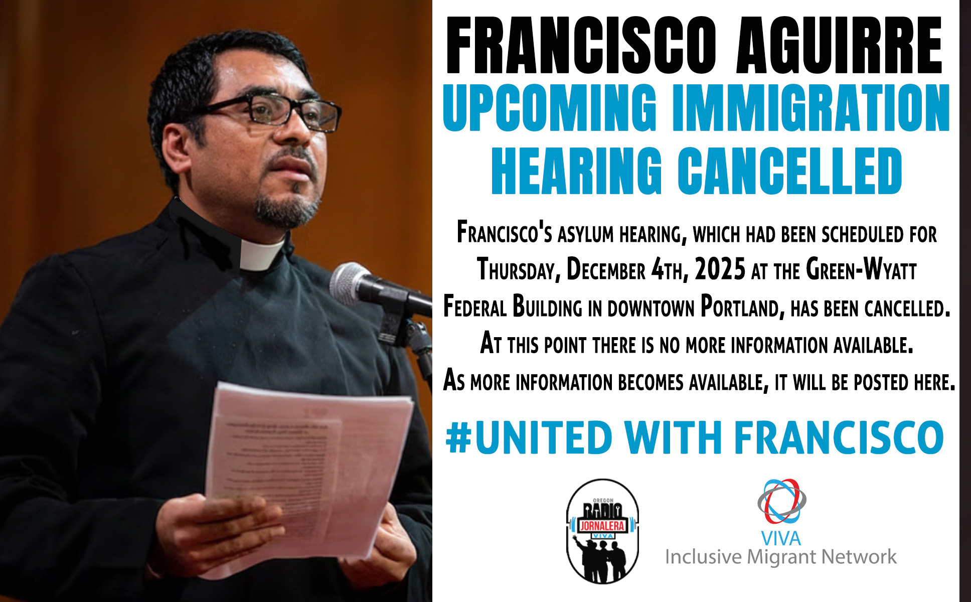 Francisco's asylum hearing, which had been scheduled for Thursday, December 4th, 2025 at the Green-Wyatt Federal Building in downtown Portland, has been cancelled. At this point there is no more information available. As more information becomes available, it will be posted here.